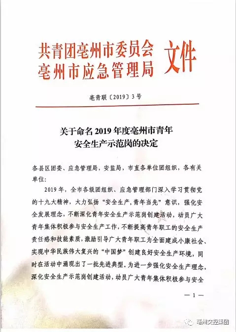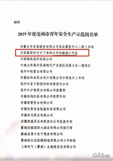 近日,團(tuán)市委、市應(yīng)急管理局印發(fā)了《關(guān)于命名2019年度亳州市青年安全生產(chǎn)示范崗的決定》,授予21個(gè)創(chuàng)建集體為2019年度亳州市青年安全生產(chǎn)示范崗,集團(tuán)團(tuán)委推薦的安行天下駕培公司訓(xùn)練場小車隊(duì)名列其中。