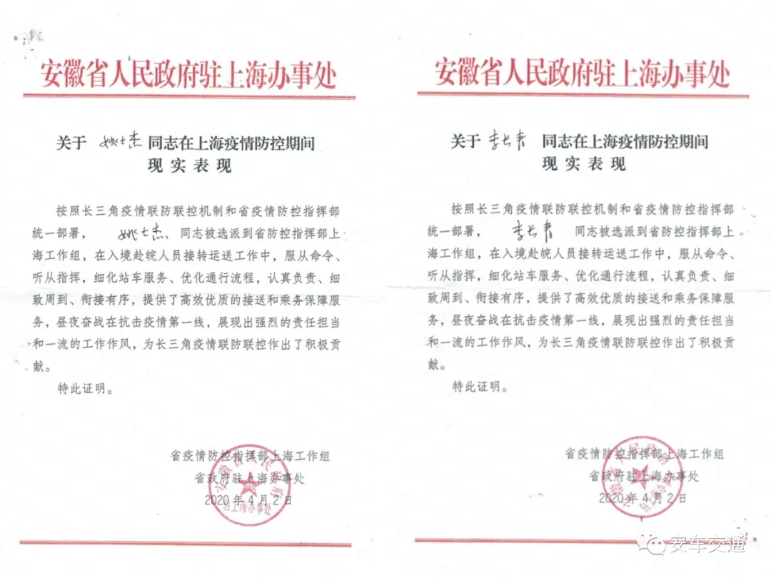 證明文件中寫道,“兩人在入境赴皖人員接轉(zhuǎn)運送工作中,服從命令、聽從指揮,細化站車服務(wù)、優(yōu)化通行流程,認(rèn)真負(fù)責(zé)、細致周到、銜接有序,提供了高效優(yōu)質(zhì)的接送和乘務(wù)保障服務(wù),晝夜奮戰(zhàn)在抗擊疫情第一線,展現(xiàn)出強烈的責(zé)任擔(dān)當(dāng)和一流的工作作風(fēng),為長三角疫情聯(lián)防聯(lián)控做出了積極貢獻”。