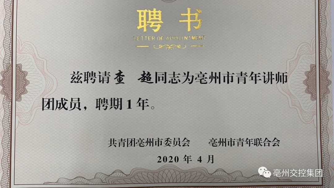 近日,團(tuán)市委印發(fā)了《關(guān)于公布亳州市“青年講師團(tuán)”講師名單的通知》,集團(tuán)團(tuán)委推薦的候選人查超順利入選市“青年講師團(tuán)”講師名單。