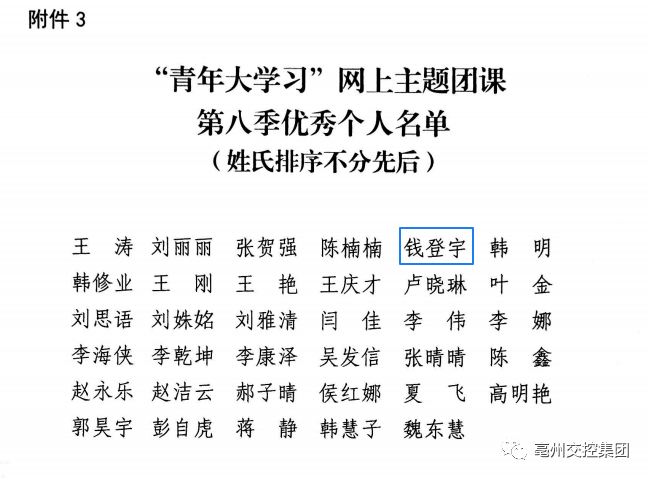 近日,團(tuán)市委印發(fā)了《關(guān)于青年大學(xué)習(xí)網(wǎng)上主題團(tuán)課第八季開展情況的通報(bào)》,在47家市直單位(企業(yè))中評選出了4家優(yōu)秀團(tuán)組織,集團(tuán)名列其中;通達(dá)利公司錢登宇獲評優(yōu)秀個(gè)人。