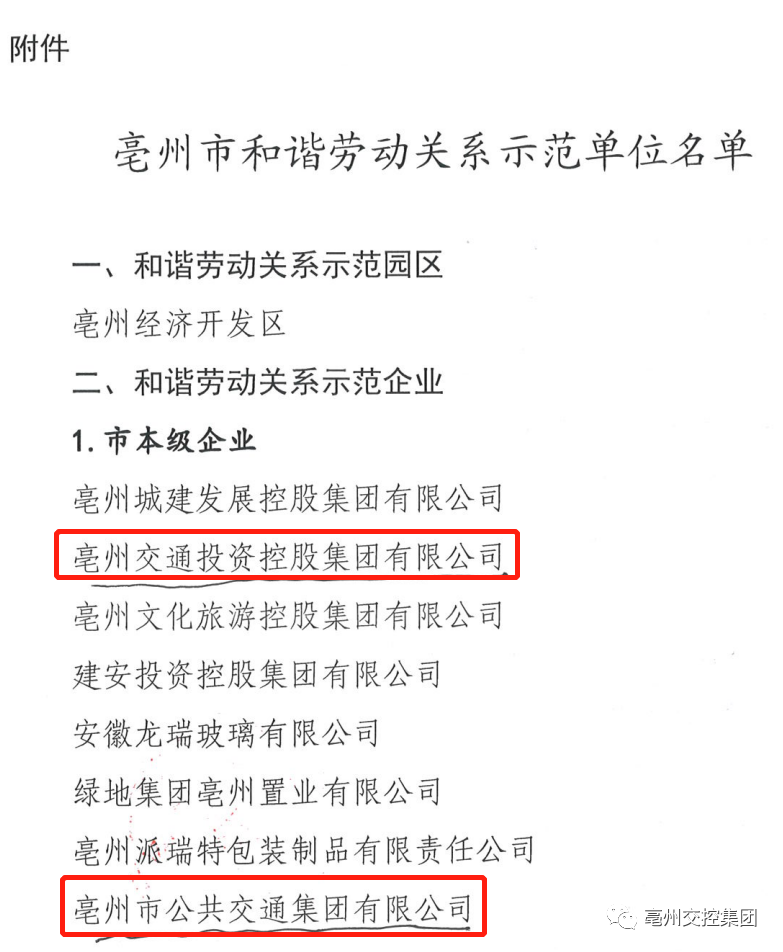 近日,由亳州市人力資源和社會保障局、亳州市總工會、亳州市企業(yè)(企業(yè)家)聯(lián)合會及亳州市工商業(yè)聯(lián)合會開展的亳州市和諧勞動關(guān)系示范單位評價確認(rèn)工作落下帷幕,交控集團被確認(rèn)為“亳州市和諧勞動關(guān)系示范企業(yè)”。