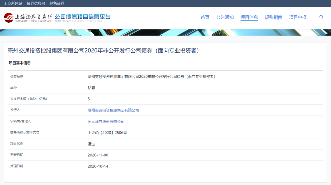 11月6日,根據(jù)上海證券交易所公司債券項(xiàng)目信息平臺(tái)公示,亳州交控集團(tuán)2020年非公開(kāi)發(fā)行公司債券項(xiàng)目狀態(tài)更新為“通過(guò)”,交易所確認(rèn)文件文號(hào)為“上證函【2020】2506號(hào)”。