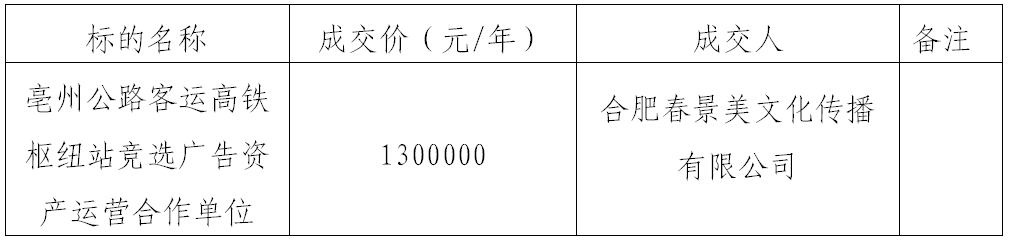 亳州公路客運(yùn)高鐵樞紐站競選廣告資產(chǎn)運(yùn)營合作單位項目(項目編號:BZJK-2020-069號)于2020年12月18日9時00分進(jìn)行公開競價,現(xiàn)競價工作已結(jié)束,并經(jīng)采購人確認(rèn),將競價結(jié)果公示如下: