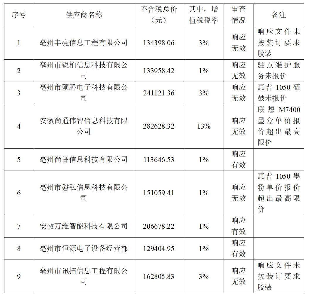 經(jīng)詢價(jià)小組認(rèn)真評(píng)比,根據(jù)確定成交人的原則,確定亳州尚譽(yù)信息科技有限公司為成交人,按預(yù)計(jì)年使用量測(cè)算后的含稅成交價(jià)為(大寫(xiě))壹拾壹萬(wàn)肆仟柒佰捌拾叁元整,(小寫(xiě))114783元,其中,增值稅稅率為1%。