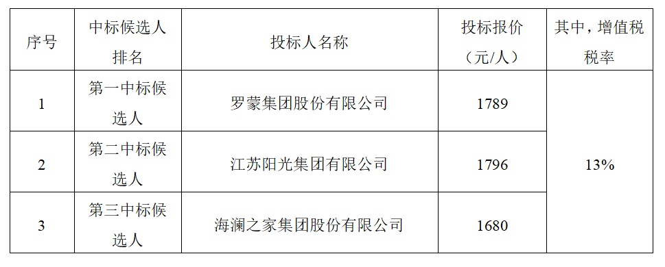 根據(jù)有關(guān)規(guī)定,招標(biāo)人確定羅蒙集團(tuán)股份有限公司為中標(biāo)人,中標(biāo)價(jià)為1789元每人,交貨期:自合同簽訂之日起20日歷天內(nèi)完成全部春秋裝(西裝上衣、西褲、長袖襯衫)量體、生產(chǎn)及供貨;自合同簽訂之日起50日歷天內(nèi)完成全部夏裝(短袖襯衫、夏褲)量體、生產(chǎn)及供貨,交貨地點(diǎn):亳州市內(nèi),招標(biāo)人指定地點(diǎn),完成本項(xiàng)目投標(biāo)產(chǎn)品的量體、生產(chǎn)、供貨、調(diào)試、售后服務(wù)等工作。
