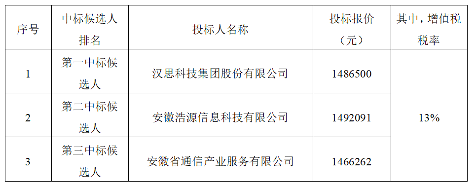 根據(jù)有關(guān)規(guī)定,招標人確定漢思科技集團股份有限公司為中標人,中標價(大寫)壹佰肆拾捌萬陸仟伍佰元,(小寫)1486500元(其中,增值稅稅率為13%),完成本項目投標設備的供貨、運輸、裝卸、技術(shù)支持與培訓、售后服務等工作,并按合同約定履行義務。