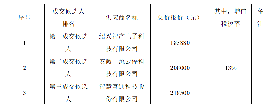 根據(jù)有關(guān)規(guī)定,采購人確定紹興智產(chǎn)電子科技有限公司為成交人,總價成交價(大寫)壹拾捌萬叁仟捌佰捌拾元整,(小寫)183880元(其中,增值稅稅率為13%),交貨期:自合同簽訂之日起7日歷天內(nèi)完成供貨、安裝、調(diào)試工作,并與采購人智慧停車管理平臺完成對接,質(zhì)量標(biāo)準(zhǔn):符合國家、地方、行業(yè)現(xiàn)行相關(guān)規(guī)范合格標(biāo)準(zhǔn),符合附件采購清單要求,按合同約定完成全部工作。