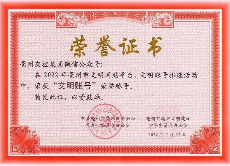 “亳州交控集團”微信公眾號榮獲“2022年亳州市文明賬號”
