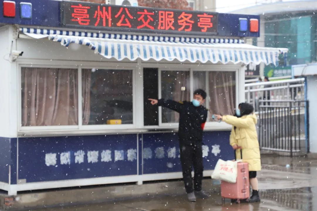1月14日上午,一場降雪如期而至,給即將到來的兔年春節(jié)增添了不少喜慶氛圍。在火車站站前廣場的亳州公交服務亭,工作人員正在向一名乘客解答公交線路問題,幫助乘客選擇最佳乘車線路,方便乘客快速到達目的地。