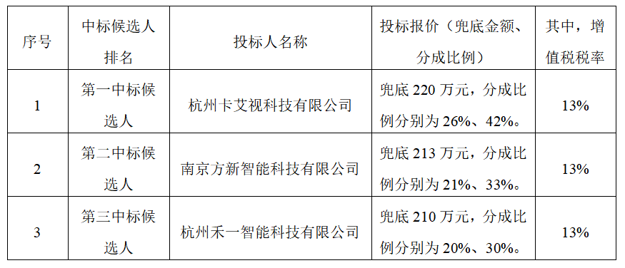 經評審,招標人確定杭州卡艾視科技有限公司為中標人,中標價為兜底金額每年不低于220萬元;年營業(yè)超過400萬元時,超過400萬元的部分招標人分成比例不低于26%;年營業(yè)收入超過600萬元時,超過600萬元的部分招標人分成比例不低于42%;其中增值稅稅率為13%。服務期限:自合同簽訂之日起5年,質量標準:符合國家、地方、行業(yè)現(xiàn)行相關規(guī)范合格標準,符合招標人要求及運營考核標準,按合同約定完成本項目全部工作。