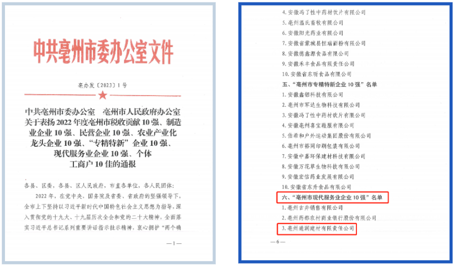 在“亳州市現(xiàn)代服務(wù)業(yè)企業(yè)10強”名單中,通潤建材公司名列第三,這是集團(tuán)下屬子公司首次獲得此殊榮。