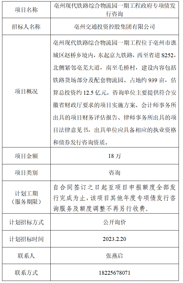 為便于潛在投標人及時了解招標信息,現將亳州交通投資控股集團有限公司(招標人名稱)的招標計劃發(fā)布如下:
