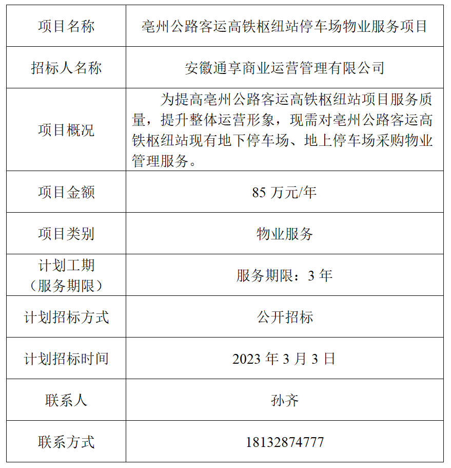 為便于潛在投標人及時了解招標信息,現將安徽通享商業(yè)運營管理有限公司的招標計劃發(fā)布如下: