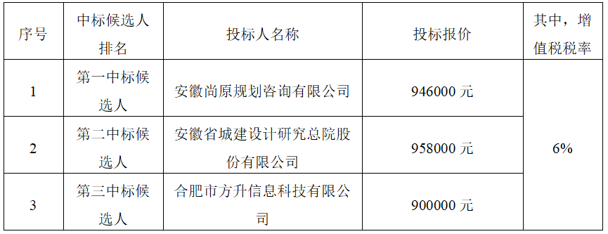 經(jīng)評審,招標(biāo)人確定安徽尚原規(guī)劃咨詢有限公司為中標(biāo)人,中標(biāo)價(jià)為人民幣(大寫)玖拾肆萬陸仟元整,(小寫)946000元(其中,增值稅稅率6%),服務(wù)期限:自合同簽訂之日起1年,按合同約定完成本項(xiàng)目全部工作。