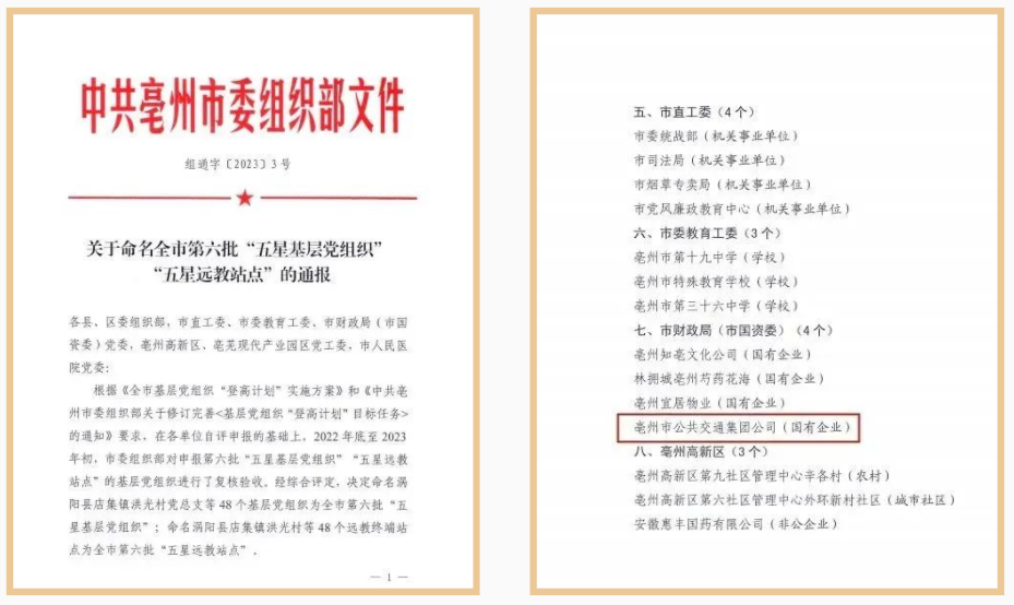近日,亳州市委組織部印發(fā)《關(guān)于命名全市第六批“五星基層黨組織”“五星遠(yuǎn)教站點(diǎn)”的通報(bào)》。亳州公交黨總支榮獲亳州市“五星遠(yuǎn)教站點(diǎn)”稱號(hào)。