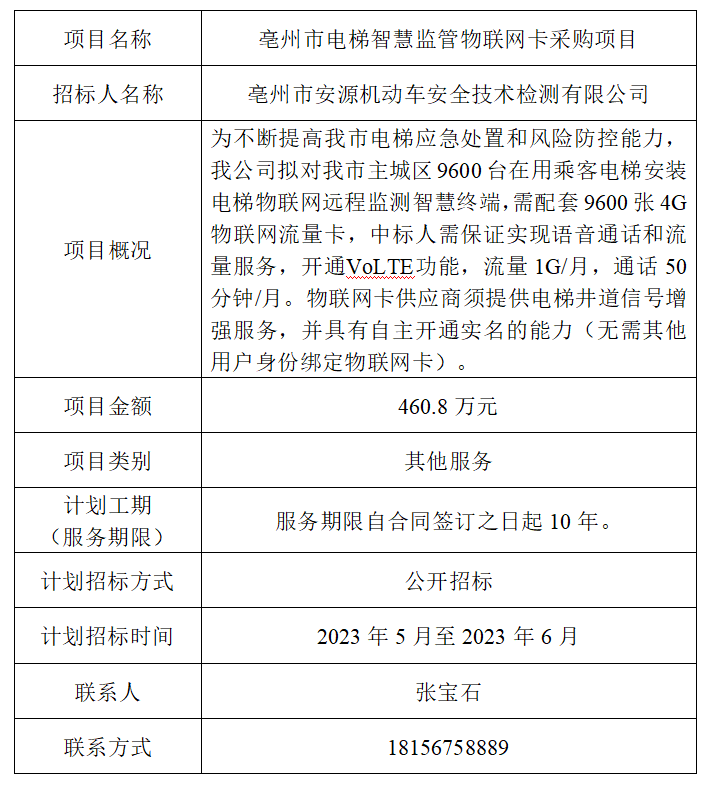 為便于潛在投標(biāo)人及時了解招標(biāo)信息,現(xiàn)將亳州市安源機動車安全技術(shù)檢測有限公司(招標(biāo)人名稱)的招標(biāo)計劃發(fā)布如下:
