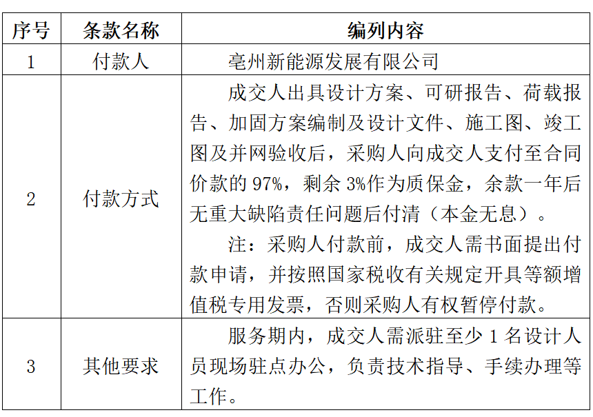 (二)服務(wù)期限:按照亳州市本級獨立的國有資產(chǎn)屋頂采取“一地、一策、一設(shè)計、一結(jié)算”模式進行實施,項目滿足咨詢條件之日起7日歷天內(nèi)完成現(xiàn)場勘查、方案設(shè)計、荷載報告分析和加固方案編制,并出具相應(yīng)設(shè)計成果文件;方案確定后3日內(nèi)完成可行性研究報告編制,經(jīng)發(fā)包人審查確認后5日歷天內(nèi)提交施工圖設(shè)計成果,竣工驗收后7日歷天內(nèi)提供竣工圖設(shè)計成果,并按照發(fā)包人要求提供項目運行調(diào)試、并網(wǎng)驗收及后續(xù)技術(shù)服務(wù)工作,配合主管部門完成驗收工作。
