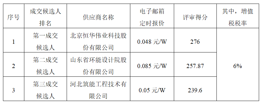 根據(jù)詢比公告規(guī)定,采購(gòu)人確定北京恒華偉業(yè)科技股份有限公司為成交人,成交價(jià)0.048元/W,增值稅稅率6%,最終合同總價(jià)以實(shí)際裝機(jī)容量為準(zhǔn),按照合同約定完成設(shè)計(jì)咨詢工作。