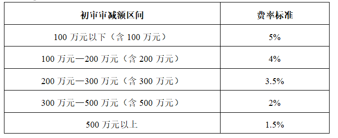 審減額費(fèi)用按“差額定率累進(jìn)法”計(jì)算,即各復(fù)審審減額區(qū)間乘以對(duì)應(yīng)費(fèi)率后綜合相加,具體區(qū)間及費(fèi)率詳見下表: