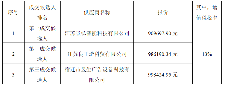 經(jīng)評(píng)審,采購(gòu)人確定江蘇景弘智能科技有限公司為成交人,成交價(jià)為人民幣(大寫)玖拾萬玖仟陸佰玖拾柒元玖角,(小寫)909697.90元(其中,增值稅稅率13%)。交貨時(shí)間:自簽訂合同之日起20日歷日內(nèi)完成公交候車亭鋼結(jié)構(gòu)成品制作、加工,自收到采購(gòu)人通知之日起2日歷日內(nèi)完成供貨、配套電子智能化設(shè)備調(diào)試等工作。交貨地點(diǎn):亳州市,采購(gòu)人指定地點(diǎn)。質(zhì)量標(biāo)準(zhǔn):符合國(guó)家、地方、行業(yè)現(xiàn)行相關(guān)規(guī)范合格標(biāo)準(zhǔn),符合設(shè)計(jì)圖紙、圖集規(guī)定標(biāo)準(zhǔn),通過采購(gòu)人驗(yàn)收。按合同約定完成本項(xiàng)目全部工作。