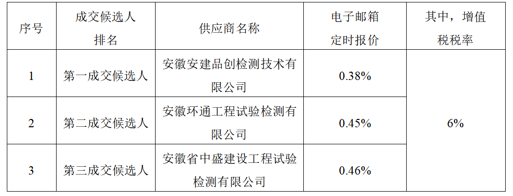 采購人確定安徽安建品創(chuàng)檢測技術有限公司為標包二交竣工檢測成交人,成交價按照施工最終審定價款為基數,費率0.38%(其中,增值稅稅率為6%),服務期限自簽訂工程建設合同之日起,至工程保修期滿,質量標準符合國家、地方、行業(yè)現行相關規(guī)范合格標準。