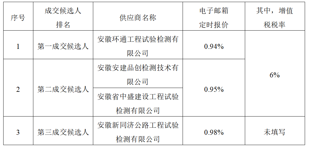 采購人確定安徽環(huán)通工程試驗檢測有限公司為標包一中心試驗室成交人,成交價按照施工最終審定價款為基數,費率0.94%(其中,增值稅稅率為6%),服務期限自簽訂工程建設合同之日起,至工程保修期滿,質量標準符合國家、地方、行業(yè)現行相關規(guī)范合格標準。