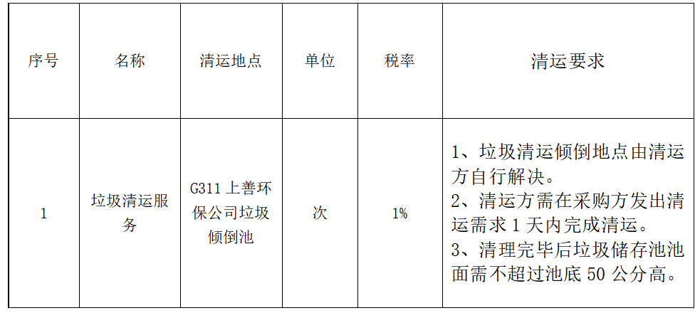 (三)交貨期:清運(yùn)方需在采購方發(fā)出清運(yùn)需求1天內(nèi)完成清運(yùn)。