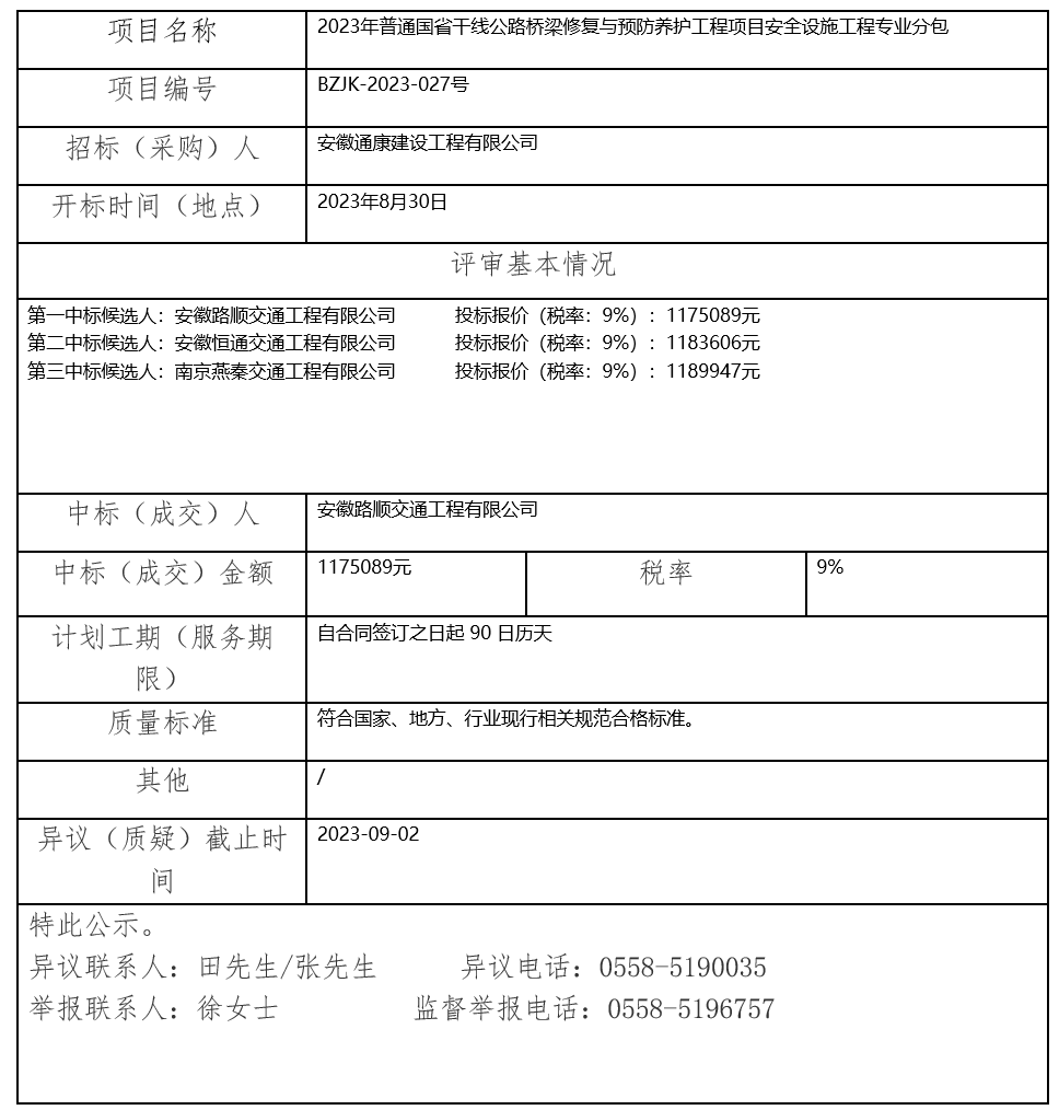 2023年普通國省干線公路橋梁修復(fù)與預(yù)防養(yǎng)護(hù)工程項目安全設(shè)施工程專業(yè)分包結(jié)果公示