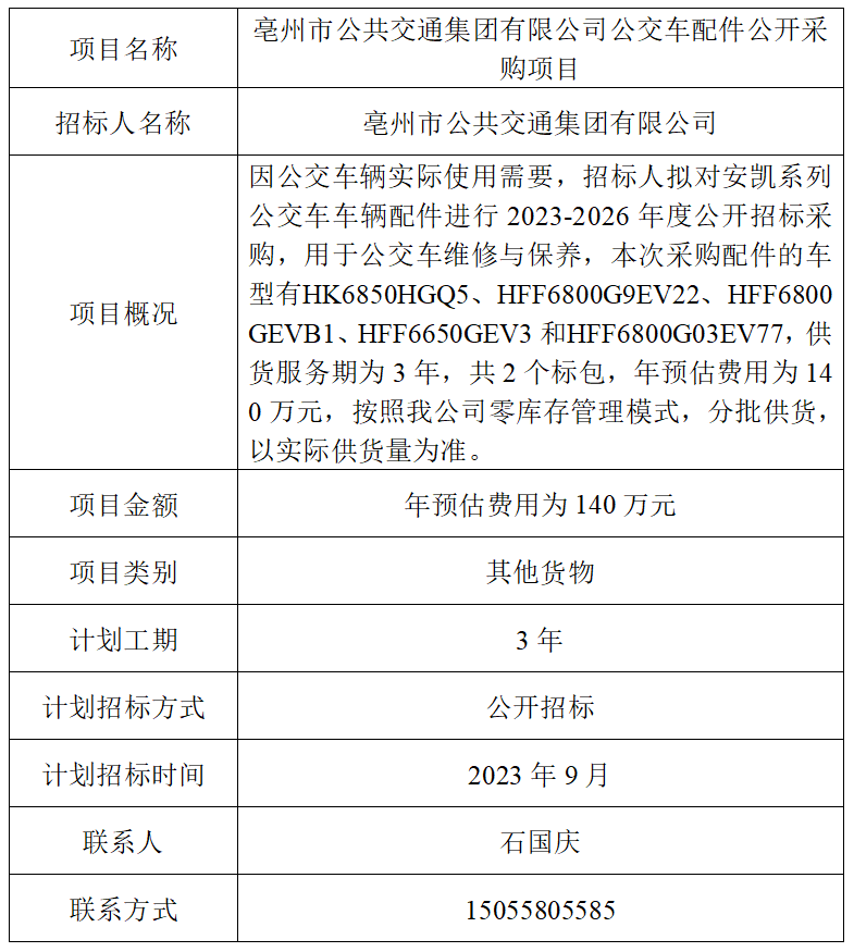 為便于潛在投標人及時了解招標信息,現(xiàn)將亳州市公共交通集團有限公司(招標人名稱)的招標計劃發(fā)布如下: