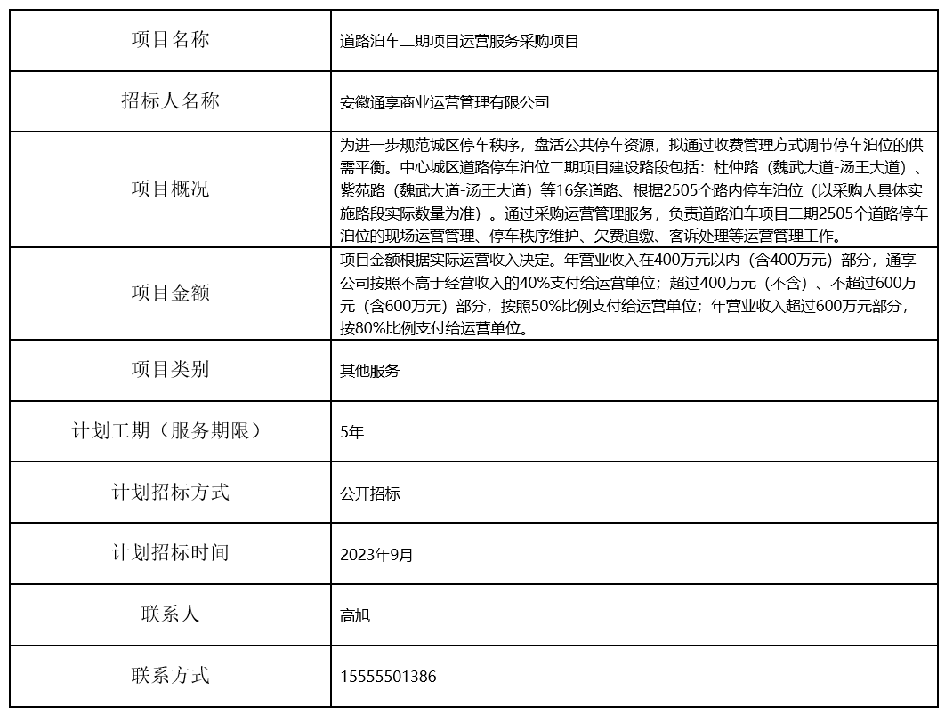 道路泊車二期項目運營服務采購項招標計劃