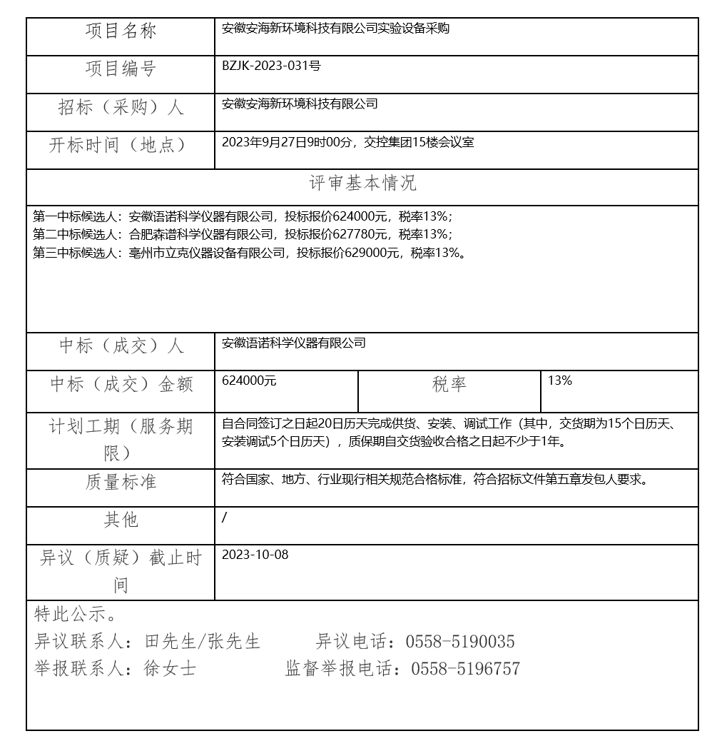 安徽安海新環(huán)境科技有限公司實驗設備采購中標(成交)結果公示