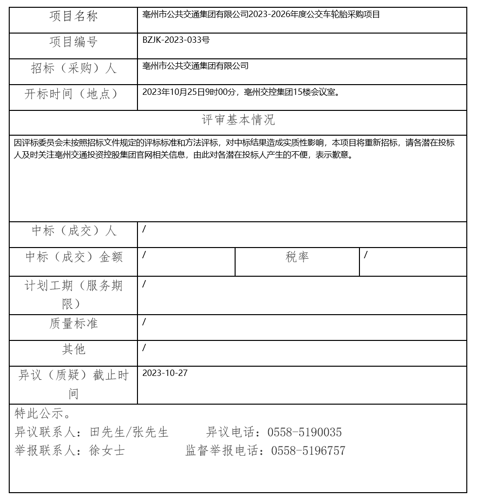 亳州市公共交通集團有限公司2023-2026年度公交車輪胎采購項目中標(成交)結果公示