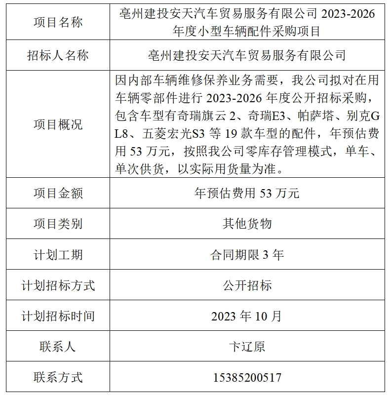 為便于潛在投標(biāo)人及時了解招標(biāo)信息,現(xiàn)將亳州建投安天汽車貿(mào)易服務(wù)有限公司(招標(biāo)人名稱)的招標(biāo)計劃發(fā)布如下: