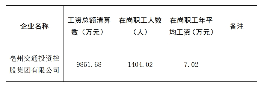 根據(jù)《亳州市市屬企業(yè)工資總額管理暫行辦法》(亳國資管〔2019〕37號(hào))有關(guān)規(guī)定,現(xiàn)將亳州交控集團(tuán)2021年度工資分配信息披露如下: