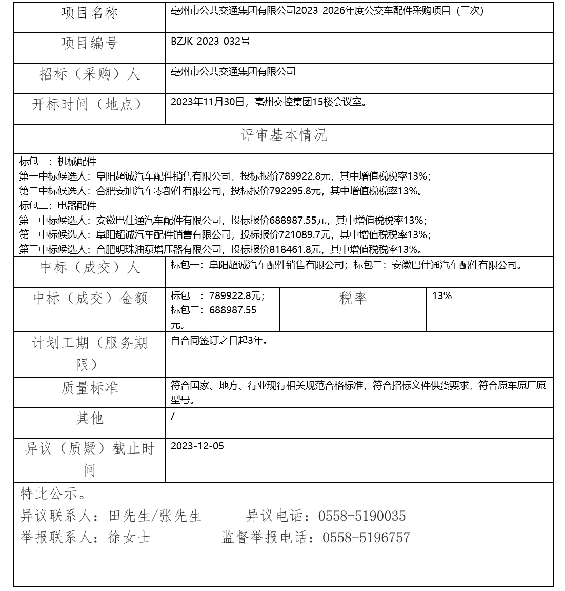 亳州市公共交通集團(tuán)有限公司2023-2026年度公交車配件采購項(xiàng)目(三次)中標(biāo)(成交)結(jié)果公示