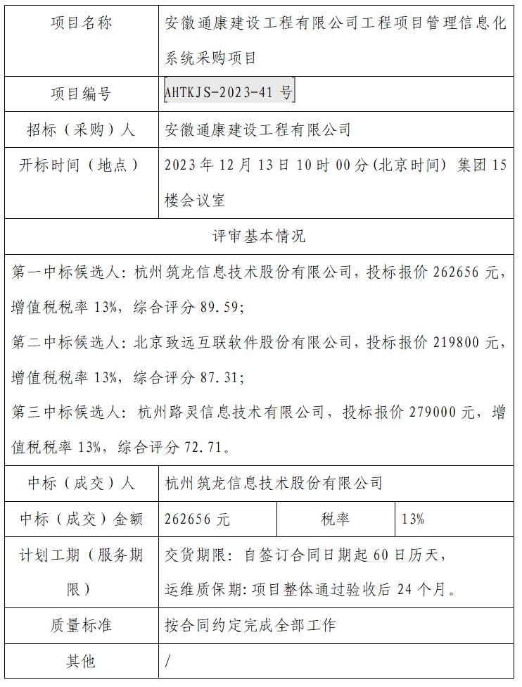 安徽通康建設(shè)工程有限公司工程項(xiàng)目管理信息化系統(tǒng)采購項(xiàng)目中標(biāo)(成交)結(jié)果公示