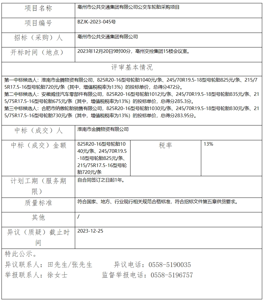 亳州市公共交通集團有限公司公交車輪胎采購項目中標(biāo)(成交)結(jié)果公示