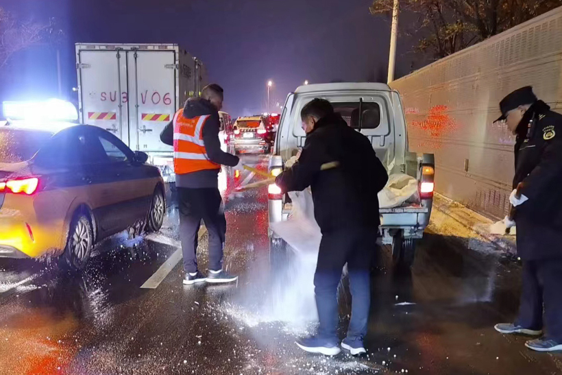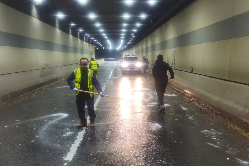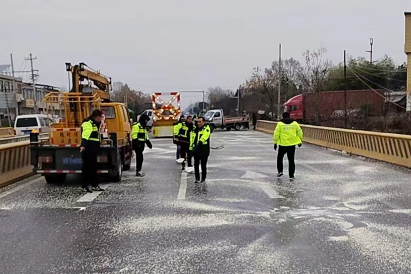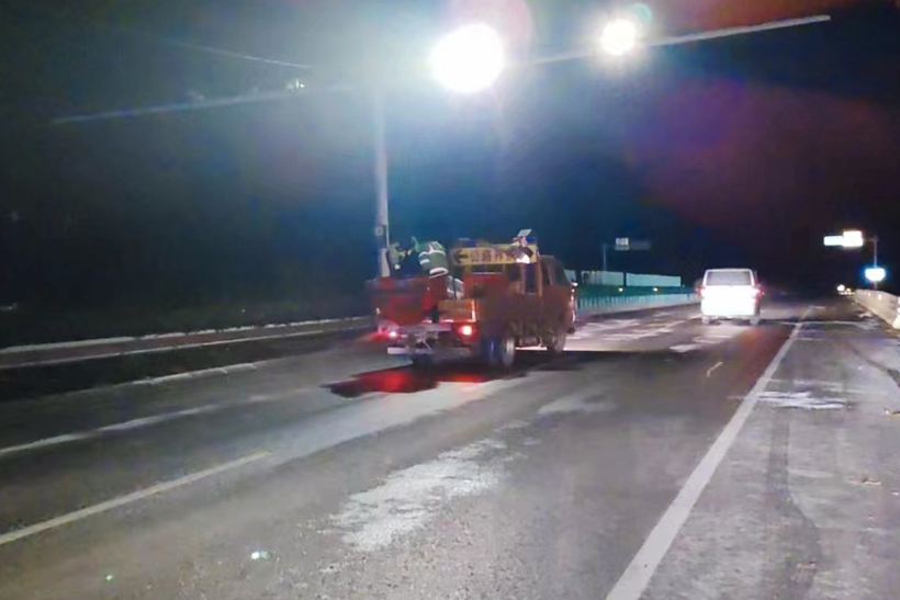 根據(jù)降雪和路面結(jié)冰情況,上善環(huán)保公司及時在城區(qū)主干道和湯王、建安兩條隧道鋪灑融雪劑,保障市民安全出行;通達利公司、通康公司積極與交警、路政部門保持協(xié)調(diào)聯(lián)動,對易結(jié)冰路段開展預防性撒布融雪劑,出動管養(yǎng)人員20余人、養(yǎng)護機械6臺、撒布里程超過150公里,撒布融雪劑近5噸,全力保障309省道安全暢通。