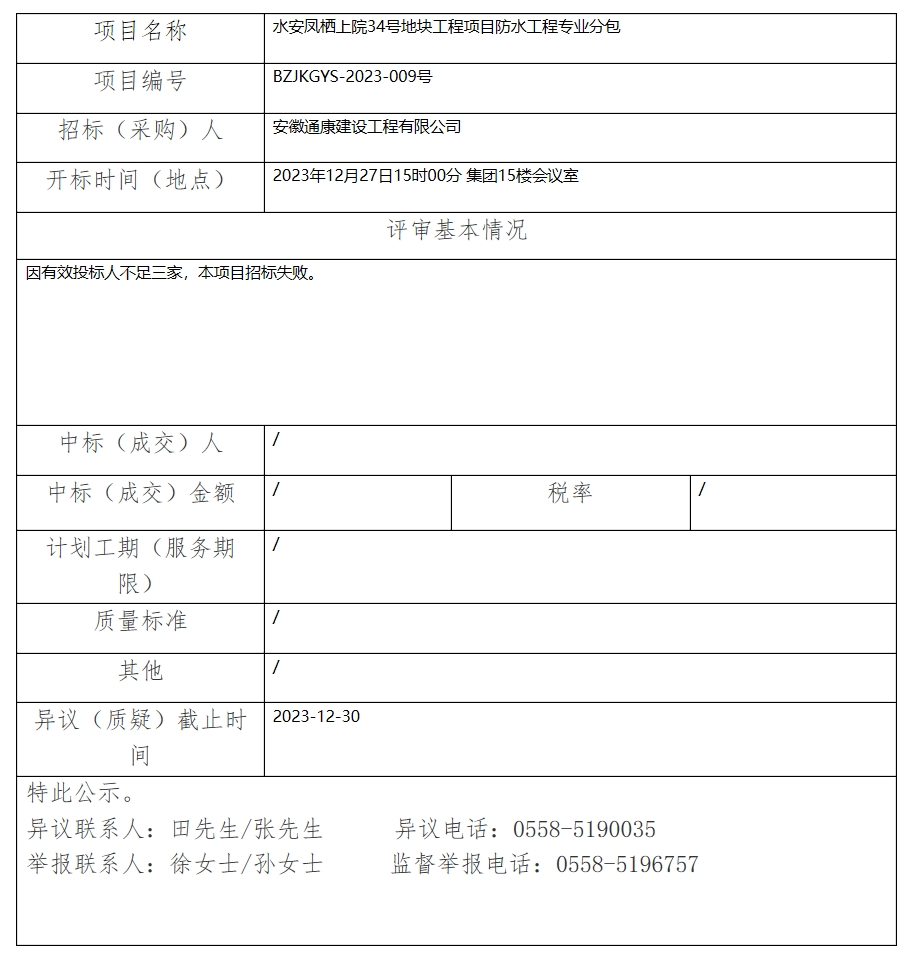 水安鳳棲上院34號(hào)地塊工程項(xiàng)目防水工程專業(yè)分包中標(biāo)(成交)結(jié)果公示