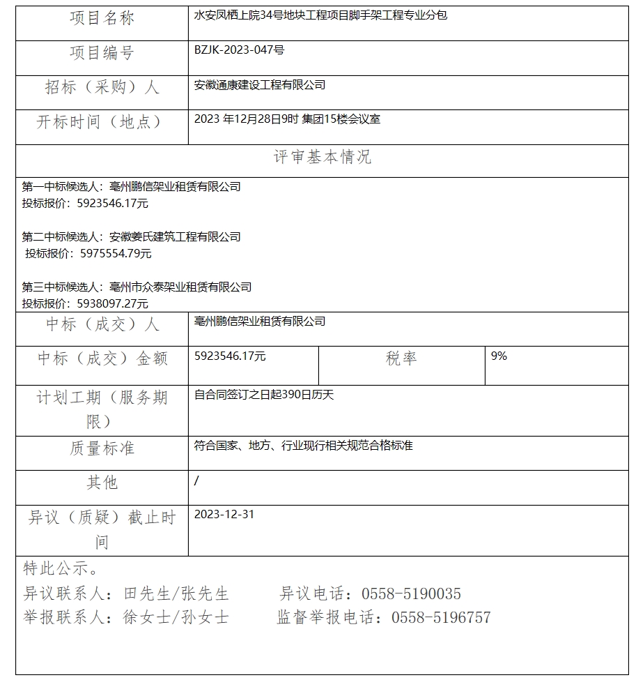 水安鳳棲上院34號(hào)地塊工程項(xiàng)目腳手架工程專業(yè)分包中標(biāo)(成交)結(jié)果公示