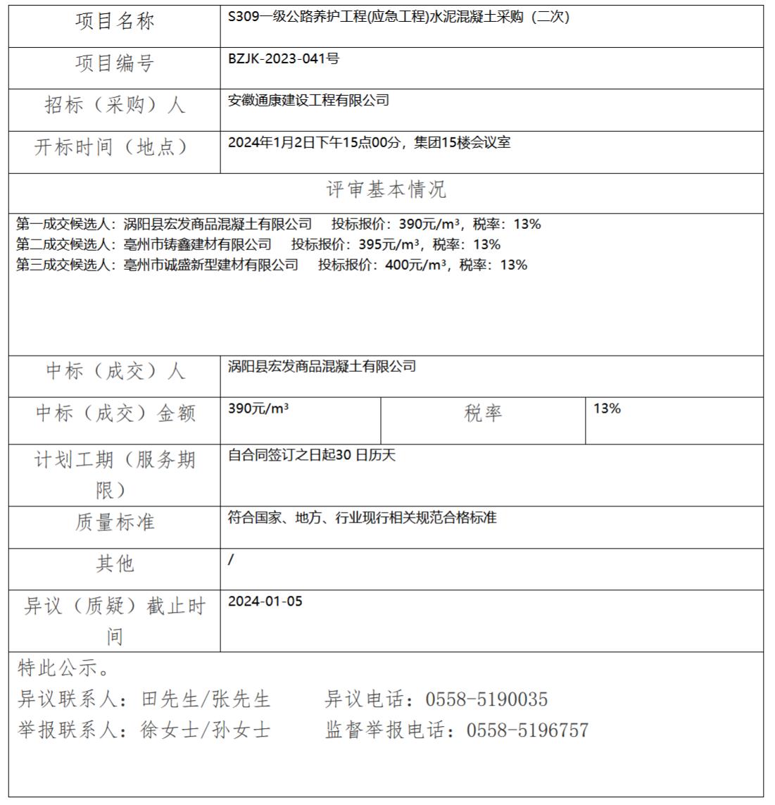 S309一級公路養(yǎng)護(hù)工程(應(yīng)急工程)水泥混凝土采購(二次)中標(biāo)(成交)結(jié)果公示