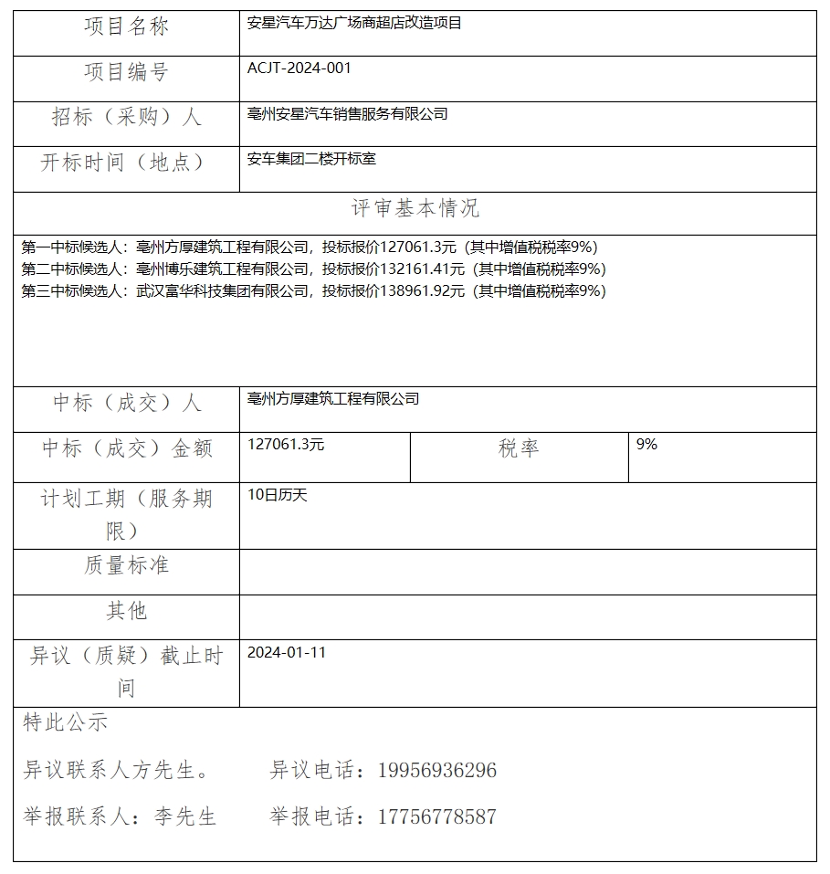 安星汽車萬達廣場商超店改造項目中標(biāo)(成交)結(jié)果公示