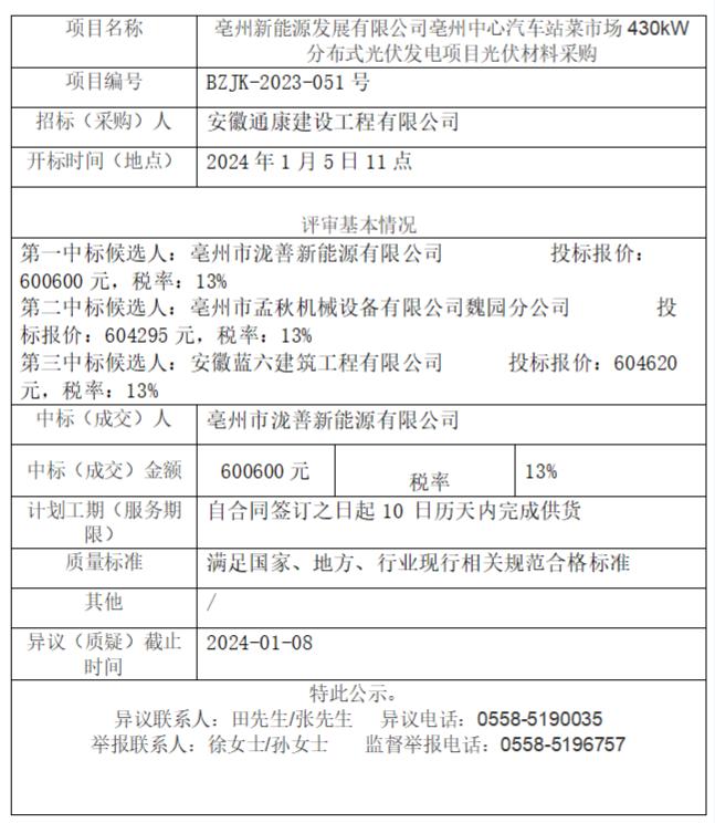 亳州新能源發(fā)展有限公司亳州中心汽車站菜市場430kW分布式光伏發(fā)電項目光伏材料采購中標(成交)結果公示