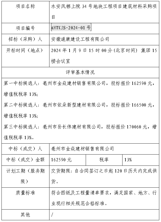 水安鳳棲上院34號地塊工程項目建筑材料采購項目中標(成交)結果公示