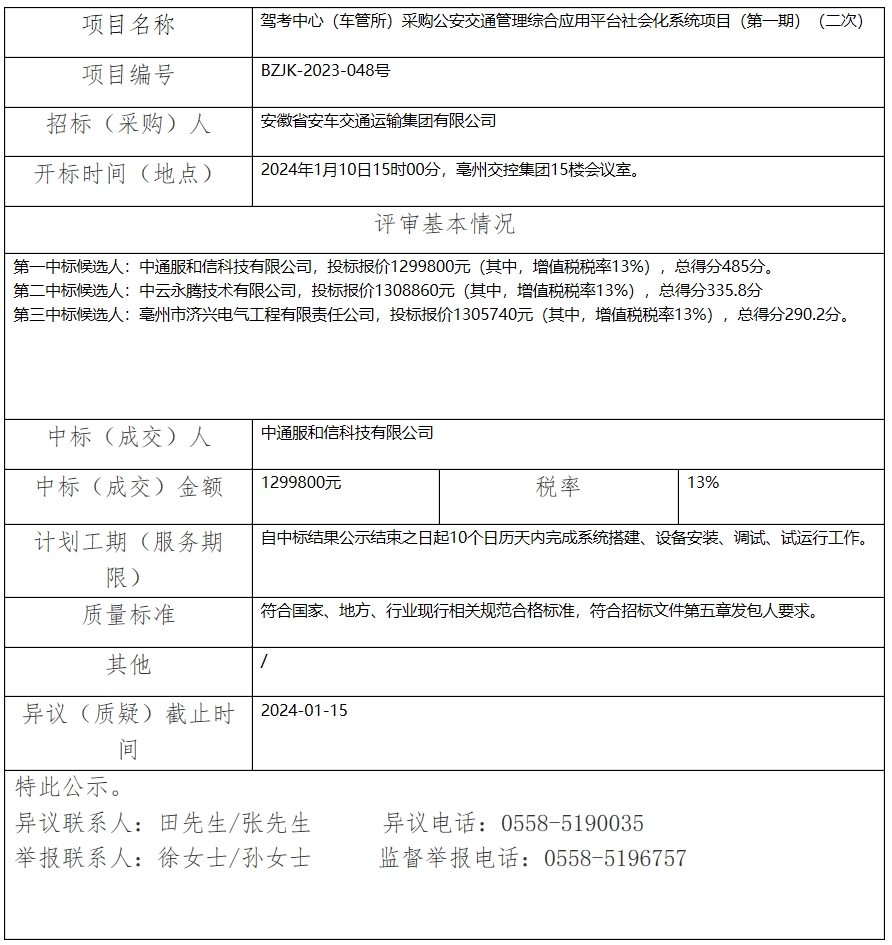 駕考中心(車(chē)管所)采購(gòu)公安交通管理綜合應(yīng)用平臺(tái)社會(huì)化系統(tǒng)項(xiàng)目(第一期)(二次)中標(biāo)(成交)結(jié)果公示