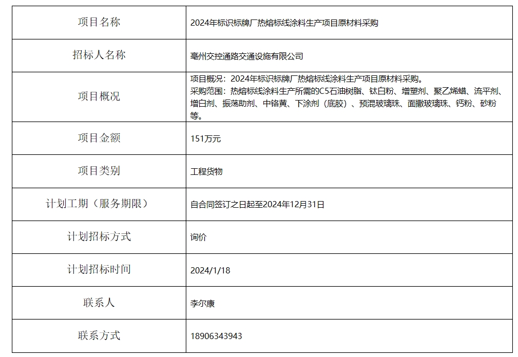 2024年標識標牌廠熱熔標線涂料生產(chǎn)項目原材料采購招標計劃
