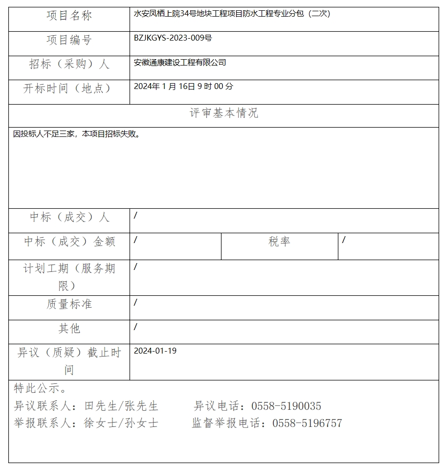 水安鳳棲上院34號(hào)地塊工程項(xiàng)目防水工程專業(yè)分包(二次)中標(biāo)(成交)結(jié)果公示