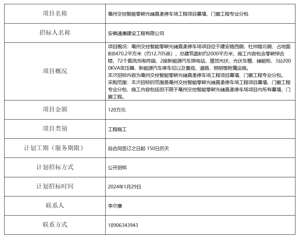 亳州交控智能零碳光儲(chǔ)直柔停車場(chǎng)工程項(xiàng)目幕墻、門窗工程專業(yè)分包招標(biāo)計(jì)劃