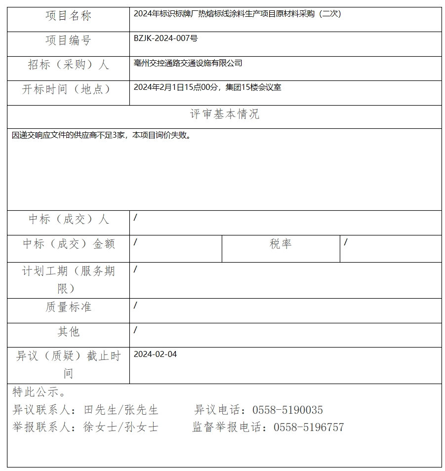 2024年標(biāo)識(shí)標(biāo)牌廠(chǎng)熱熔標(biāo)線(xiàn)涂料生產(chǎn)項(xiàng)目原材料采購(gòu)(二次)中標(biāo)(成交)結(jié)果公示