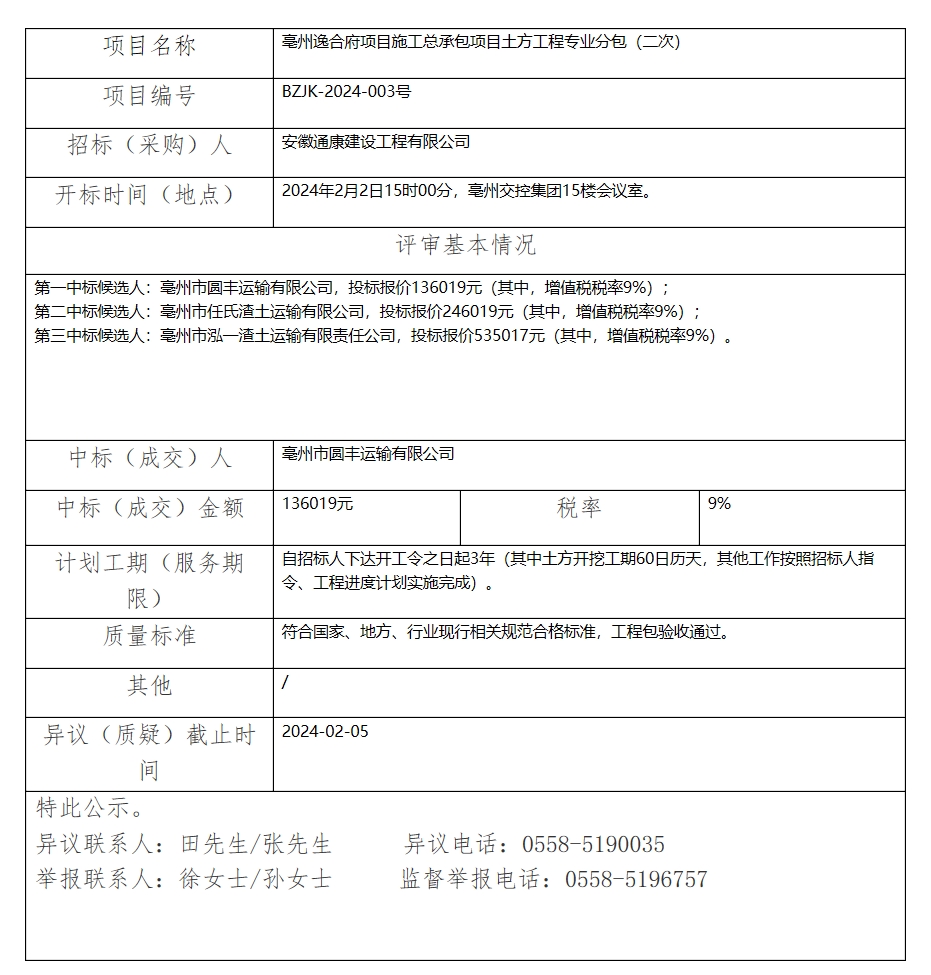 亳州逸合府項目施工總承包項目土方工程專業(yè)分包(二次)中標(biāo)(成交)結(jié)果公示